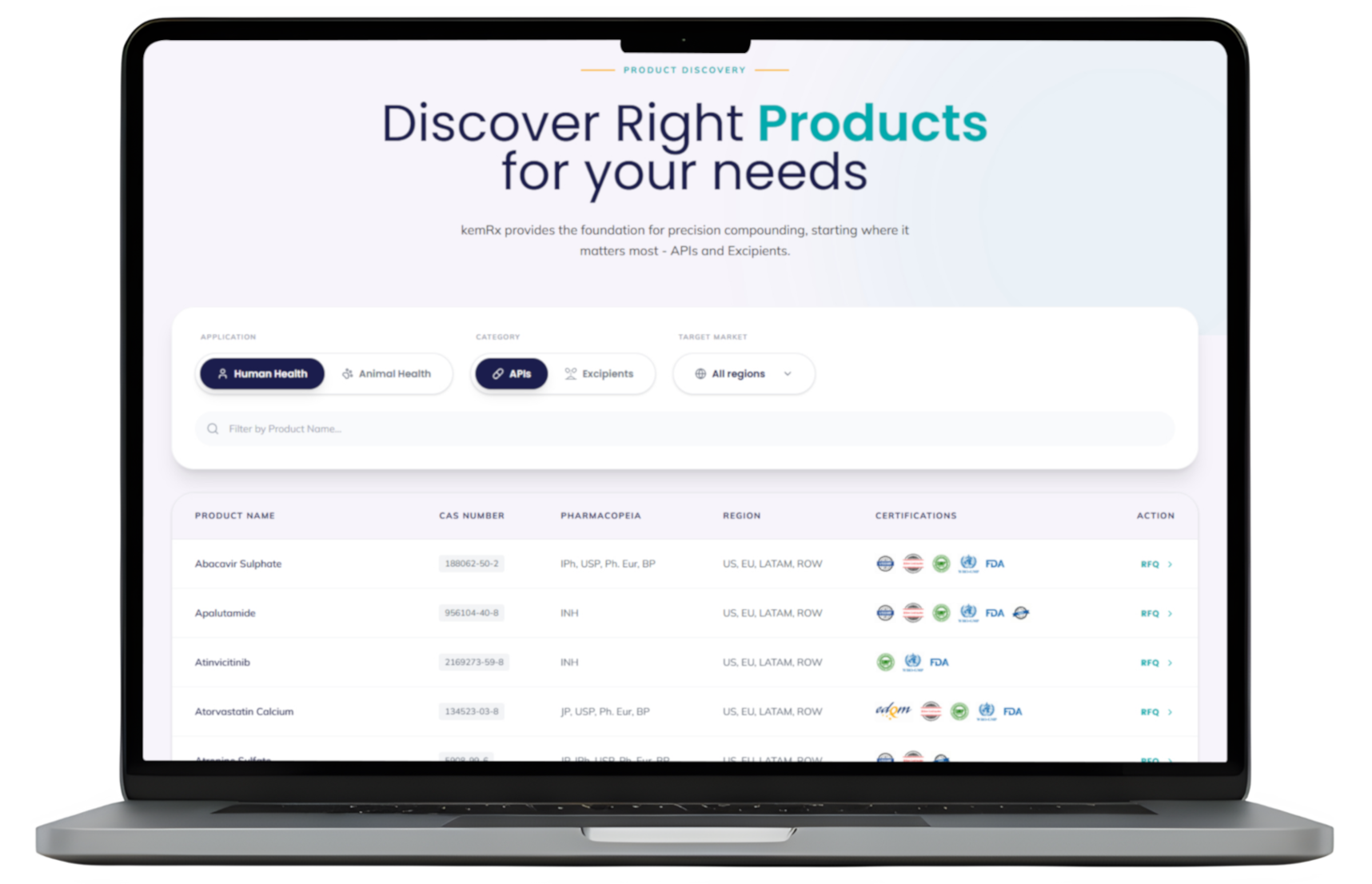 We provide a comprehensive range of Quality APIs sourced from GMP-certified manufacturers. Our platform allows for precise searching by Product Name and Target Market across domains. Every product is linked to pharmacopeial grade and supplier certification.